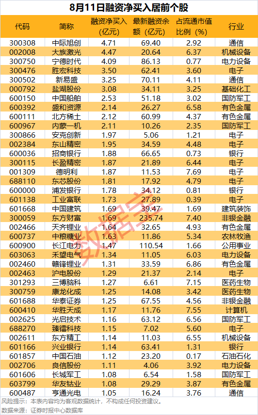 具体到个股,8月11日获融资净买入千万元以上的有672只,其中39只融资净买入额超亿元。中际旭创融资净买入额居首,当日净买入4.71亿元;其次是大族激光、宁德时代,融资净买入金额分别为4.47亿元、4.09亿元;融资净买入金额居前的还有胜宏科技、新易盛、盐湖股份等。