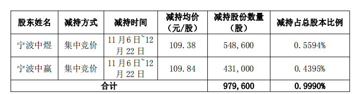 公司于近日收到宁波中煜、宁波中嬴出具的《关于股份减持计划实施完毕的告知函》,截至2025年12月23日,两位均已实施完成减持计划。11月6日至12月22日,宁波中煜通过集中竞价方式减持548,600股股份,减持均价为109.38元/股,占总股本比例0.5594%;宁波中嬴通过集中竞价方式减持431,000股股份,减持均价为109.84元/股,占总股本比例0.4395%。