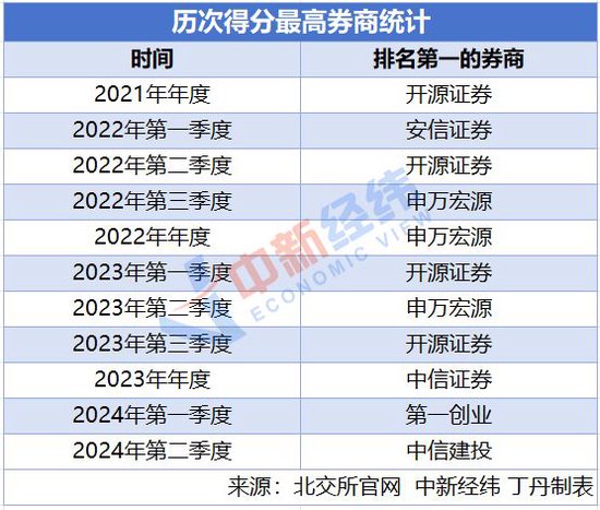 与一季度相比,二季度排名前10位的券商有中信建投、开源证券、中信证券3张“老面孔”,其中中信建投首次排名位居榜首。在此前历次的排名中,开源证券、中信证券、申万宏源、安信证券、第一创业曾先后排名第一。